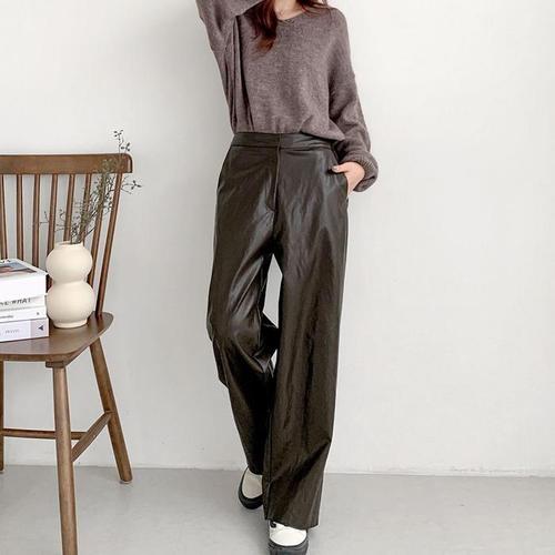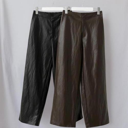 [신상오픈런]여성 스트레이트핏 가죽 팬츠 밴딩 포켓 와이드 바지 (41575086)