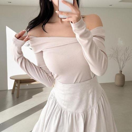 [옷자락]여성 슬림핏 오프숄더 스트랩 트임 언발 긴팔티