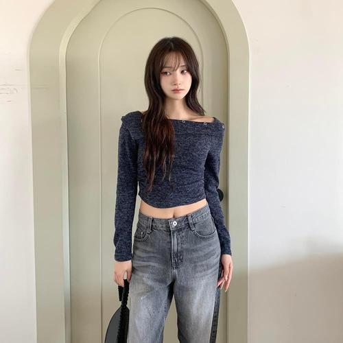 [옷자락]여성 심플 레이온 오프숄더 단추 크롭 긴팔티