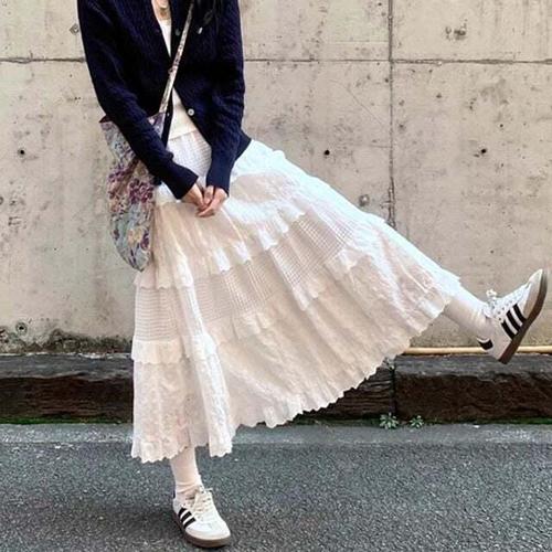 여자 레이스 바캉스룩 티어드 롱 클래식 스커트
