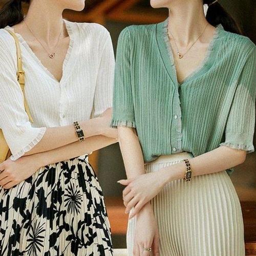 [엔젤D] 여성 프릴 자가드 레이스 반팔 니트
