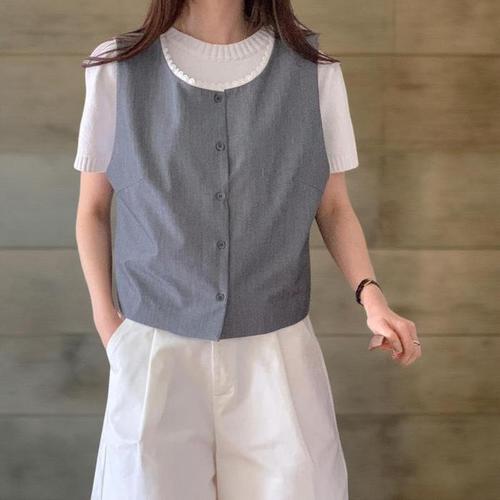 [신상오픈런]여성 대형 레이스 조합 버튼 둥근 심플 베스트 (33265496)