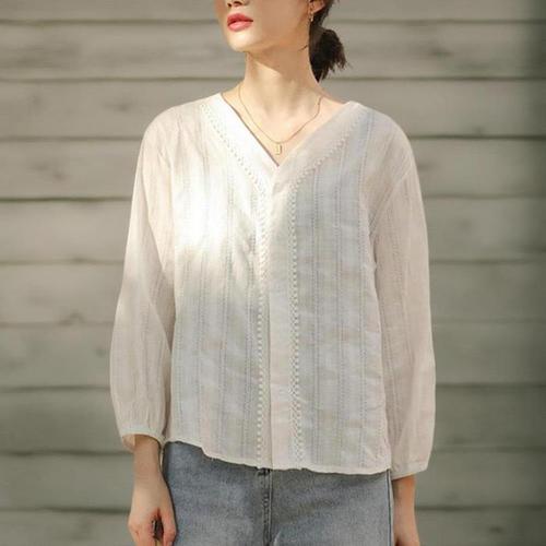 [신상오픈런]여성 브이넥 레이스 블라우스 세로줄 펀칭 디자인 (41031388)
