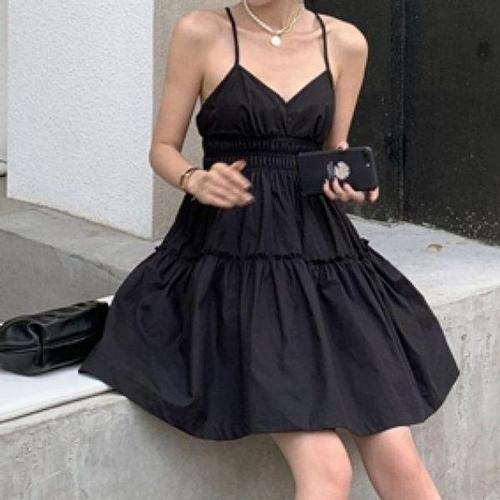 [에이치플러스몰]끈나시 인기 여자 블랙 원피스 감성 프릴 원피스 여성