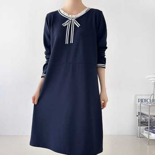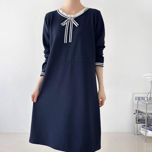여자 리본 프릴넥 큰사이즈 네이비 롱원피스