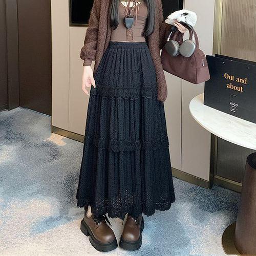 트렌딕스 여성 패치워크 레이스 스커트 2025 신상 하이웨이스트 슬림 홀로우 아웃 맥시 스커트 가을 브라운 패션 파티 클럽 보헤미안 스커트