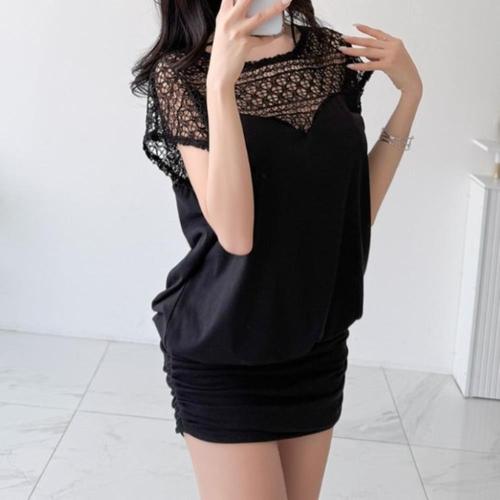[신상오픈런]여성 독특한 반목 레이스 시스루 셔링 미니 드레스