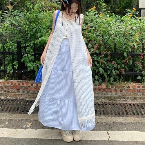 [무드수]페미닌 레이스 니트 레이어드 베스트 가디건 원피스