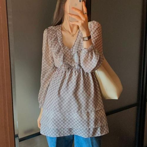 [신상오픈런]브이넥 체크 살랑 엠파이어 레이어드 티어드 쉬폰원피스 (30100154)