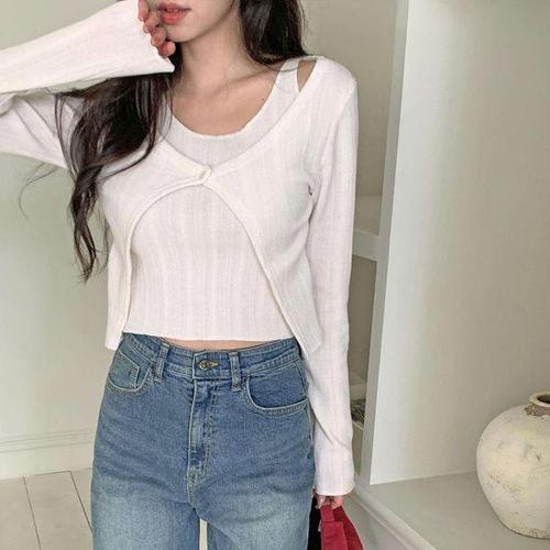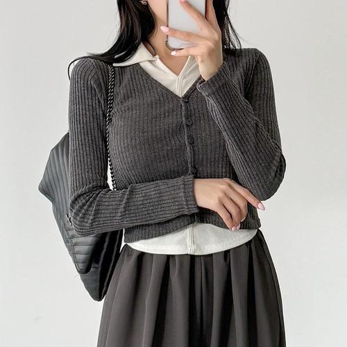 [옷자락]여성 여리핏 레이어드 카라티 골지 긴팔 가디건