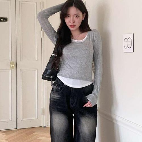 [신상오픈런]발레코어 라운드넥 키작녀 크롭 투톤 레이어드티셔츠 (30495162)