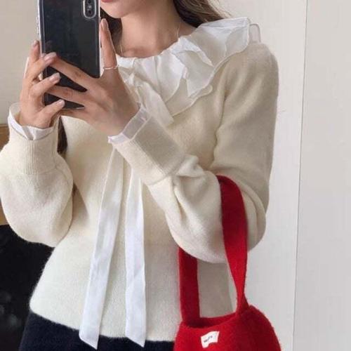 [셀럽하우스]데이트룩 XOUZ4839 하객룩 모임룩 레이어드 리본 프릴 카라니트