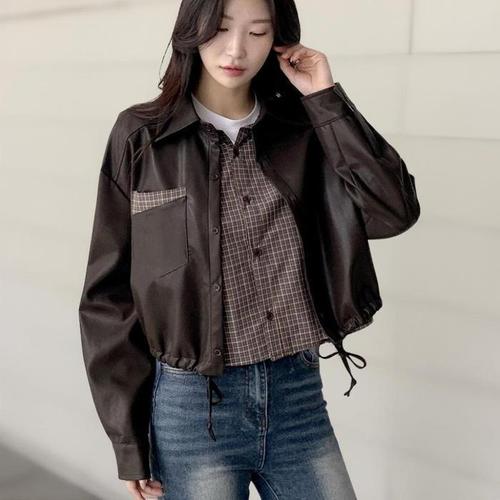 [신상오픈런]여성 체크 레이어드 셔츠 포켓 카라넥 스트링 가죽 재킷 (42510740)