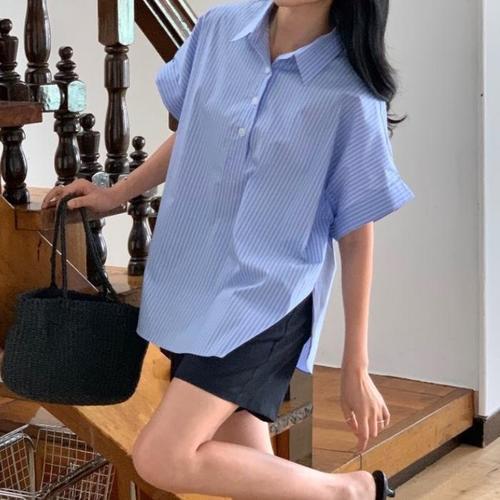 [신상오픈런]여성용 루즈핏 반팔 남방 면혼합 레이온 언발란스 트임 디자인 (38565164)