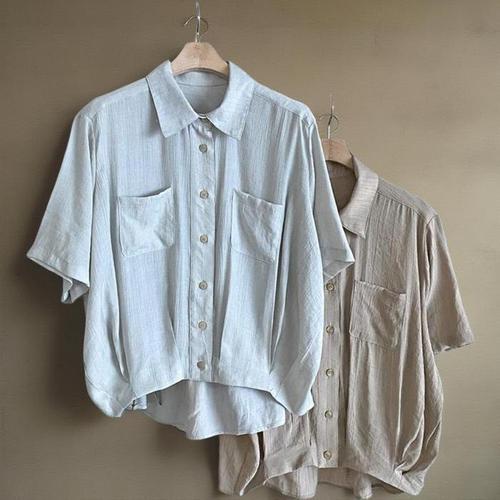 [신상오픈런]여성 루즈핏 반팔 남방 면혼합 레이온 언발란스 트임 셔츠 (38565152)