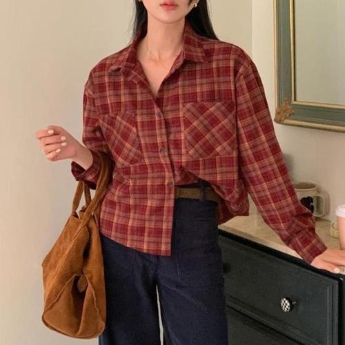 [신상오픈런]여성용 체크 패턴 크롭 레이온 셔츠 투포켓 디자인 (42614587)