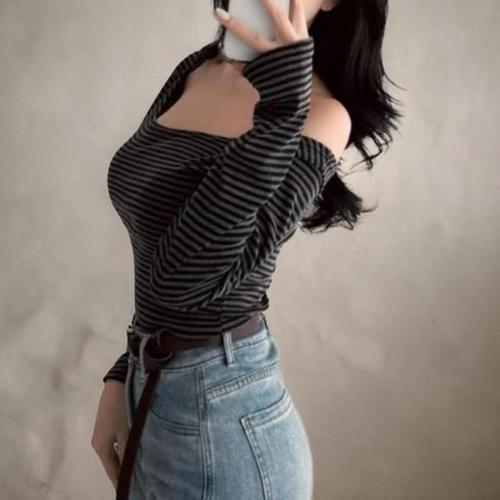 [신상오픈런]여성용 스트라이프 오프숄더 긴팔 티셔츠 레이온 스판 (41992654)