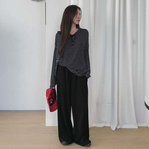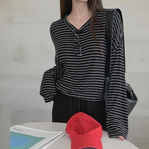 [신상오픈런]여성 레이온 스판 스트라이프 긴팔 라운드 티셔츠 (42006101)