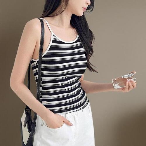 [신상오픈런]여성 키치 무드 스트라이프 레이온 스판 민소매 티셔츠 (40953224)