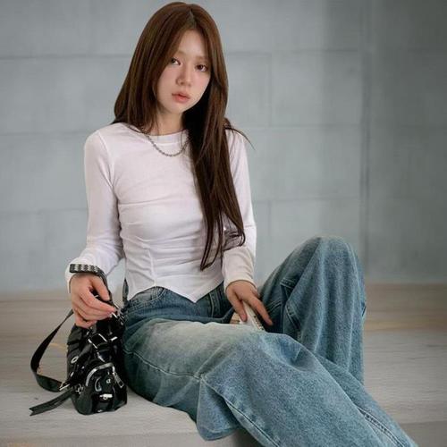 [신상오픈런]여성 심플 레이온 스판 언밸런스 긴팔 티셔츠 (41913725)