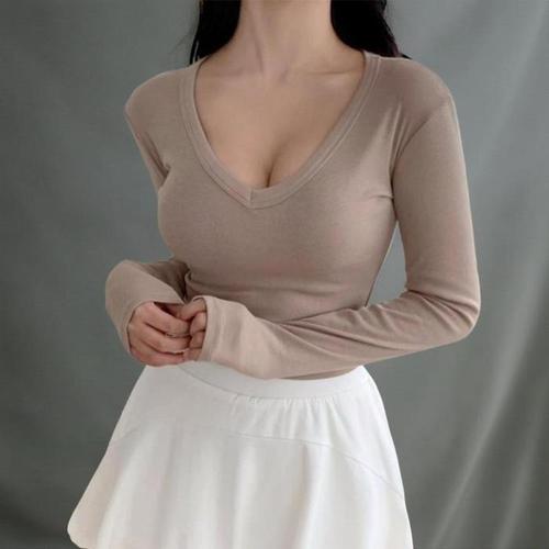 [신상오픈런]여성 브이넥 슬림핏 긴팔 크롭 티셔츠 쫀쫀한 스판 레이온 (41564291)