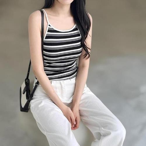 [신상오픈런]여성 키치 스타일 스트라이프 레이온 스판 민소매 티셔츠 (41031415)