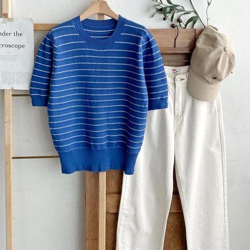 [신상오픈런]라운드넥 스트라이프니트 시보리 레이온 반팔티셔츠 (31862608)