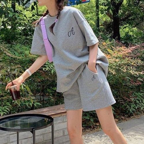 [엄지척]라운드 반팔티 자수레터링 캐주얼 투피스_19629446_667501