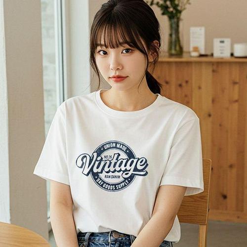 허블리 여성 프린팅 라운드넥 면 반팔 티셔츠