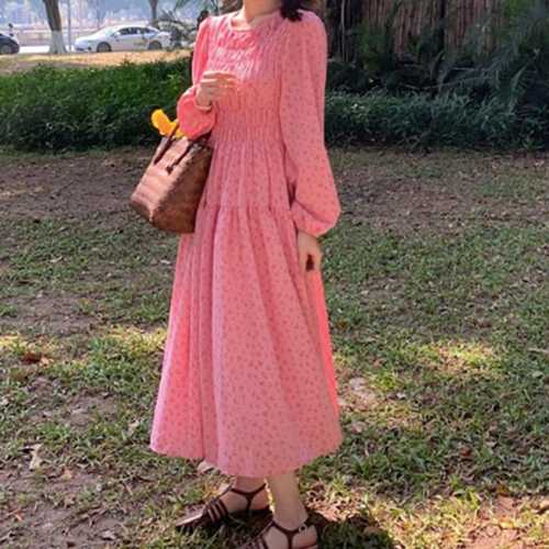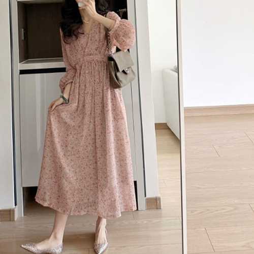플라워 쉬폰 여성 봄가을 롱원피스 여성 긴팔 랩 스타일 데일리