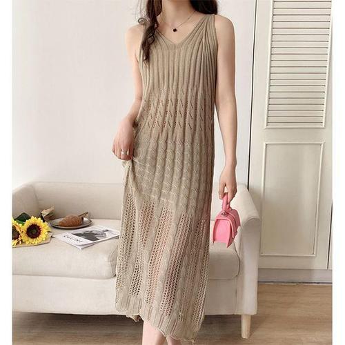 [패션시그널]브이넥 뜨게패턴 민소매 롱원피스 D2D6C4