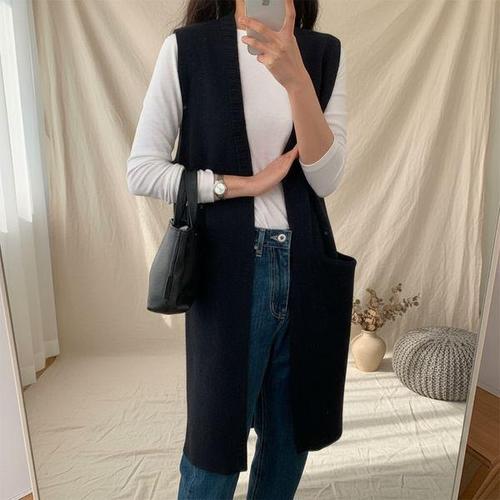 [다잇템]여성 밑트임 더블포켓 스웨터 롱 V넥 민소매