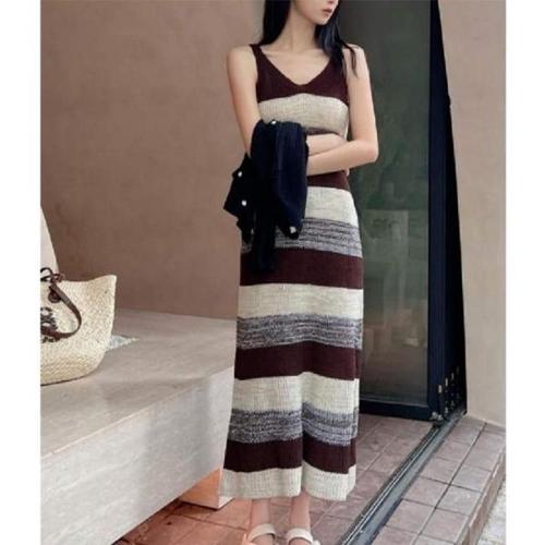 [엄지척]여성 여름 배색 스트라이프 민소매 니트 롱 원피스_19957792_667501