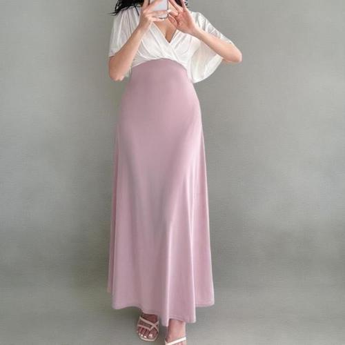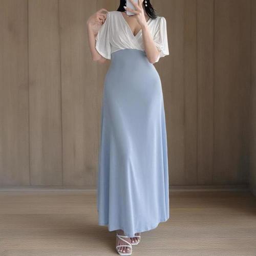 [신상오픈런]여성 셔링 브이넥 랩 스타일 반팔 투톤 플레어 롱 드레스 (39101402)