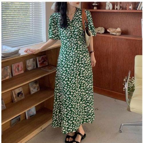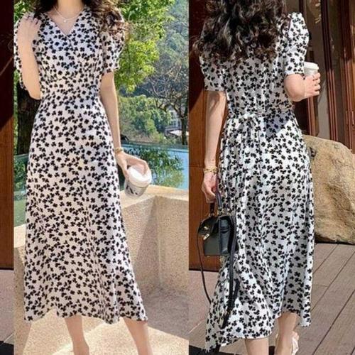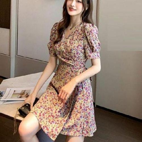 [에이치플러스몰]여름 플라워 반팔 랩 원피스 브이넥 롱 퍼프 휴양지