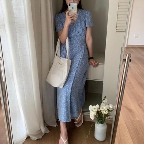 [오너클랜]인기상품 여성 블루 플라워 원피스 러블리 반팔 랩 롱원피스 [WFJG30R_251108]
