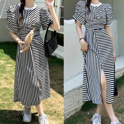 [에이치플러스몰]스트라이프 라운드넥 랩 롱 원피스