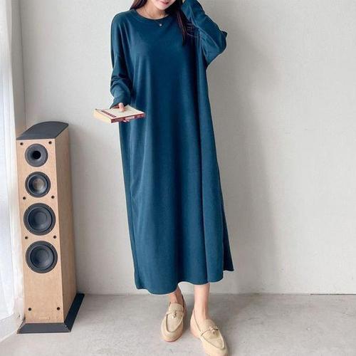 [유야]여성 면 무지 박스 라운드 긴팔 롱 티셔츠 -FTS0374- 봄 가을