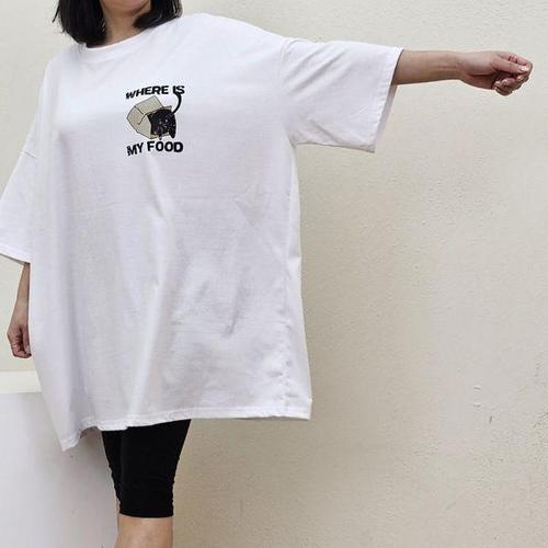 [에이치플러스몰]루즈핏 웨어이즈마이푸드 박스 반팔 롱 티셔츠