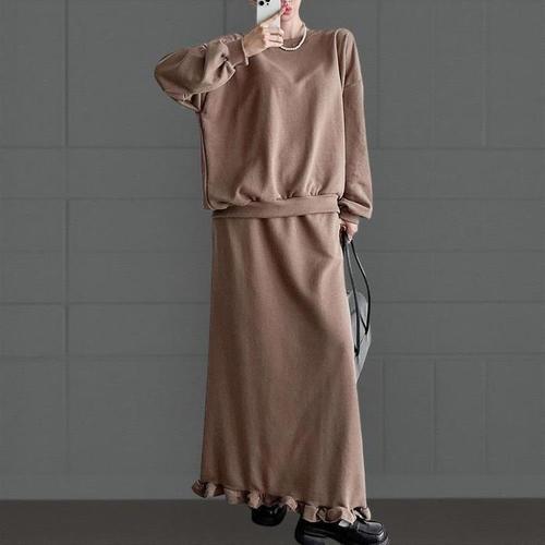 [신상오픈런]여성 기모 맨투맨 빅사이즈 롱스커트 투피스 세트 (44092096)