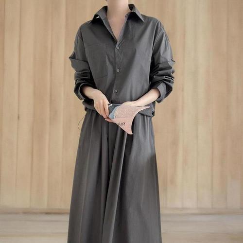 [신상오픈런]여자 스트링 포켓 긴팔셔츠 밴딩 플레어 롱스커트 세트 (41437551)
