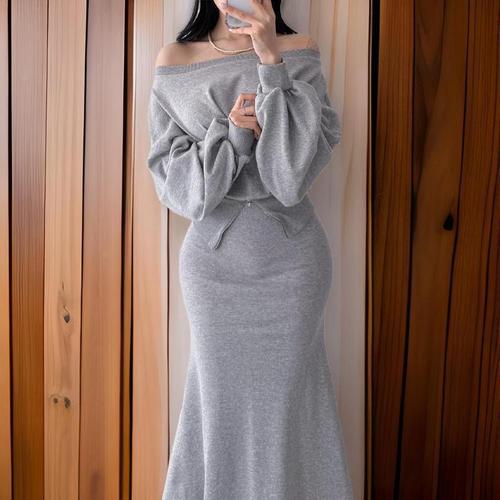 [신상오픈런]여성 오프숄더 시보리 맨투맨과 머메이드 롱스커트 세트 (32331359)