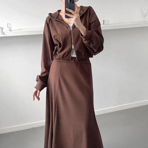 [신상오픈런]여자 크롭 투웨이 포켓 후드집업 플레어 롱스커트 세트 (42357133)