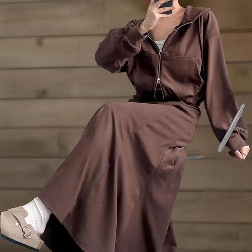 더시럽 여성용 꾸안꾸 후드집업 롱 스커트 투피스