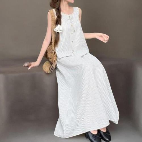 [신상오픈런]여성용 셔링 블라우스와 롱스커트 세트 민소매 의상 (41316061)