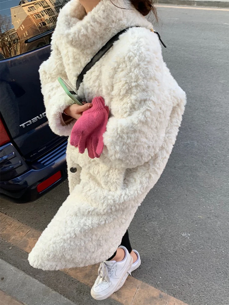 2025 여성 빈티지 인조 모피 울 롱 럭셔리 오버코트 시크 풀 슬리브 브이넥 레이스업 루즈 코트 신상 여성 출퇴근 아우터