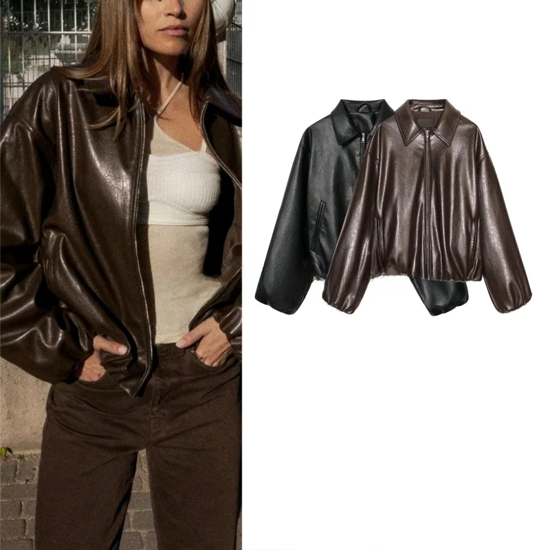 여성 재킷 2025년 가을 신상 블랙 롱 슬리브 페블 인조 가죽 재킷 오토바이 스타일 개성 패션