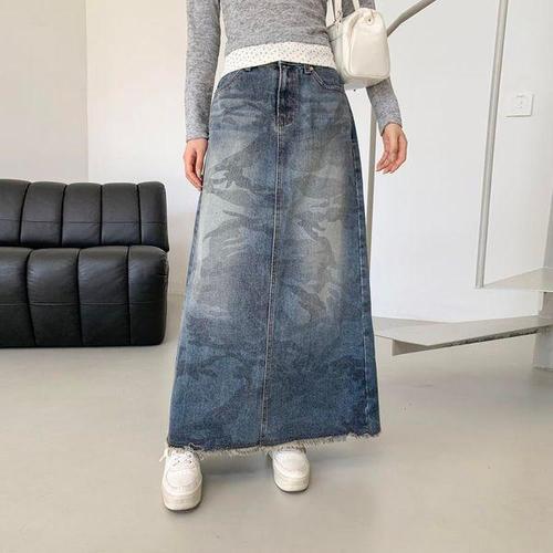 [옷자락]여성 카모 워싱 데님 롱스커트 트임 무드 스커트