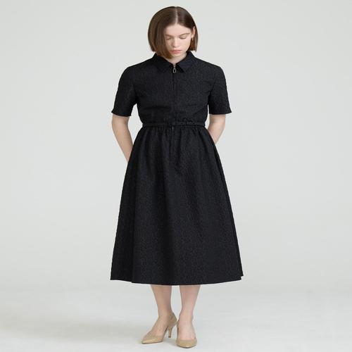 블랙 레오파드패턴 자카드 카라넥 반팔 롱 원피스 (DLDR5B305BK)