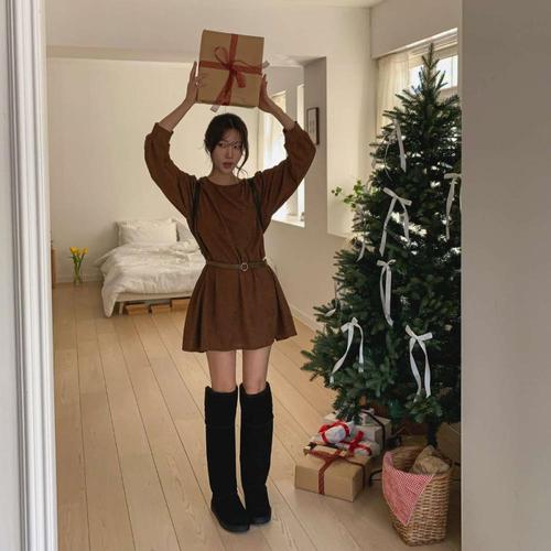 여성 혁대 골덴 포함 롱슬리브티 쁘띠 드레스